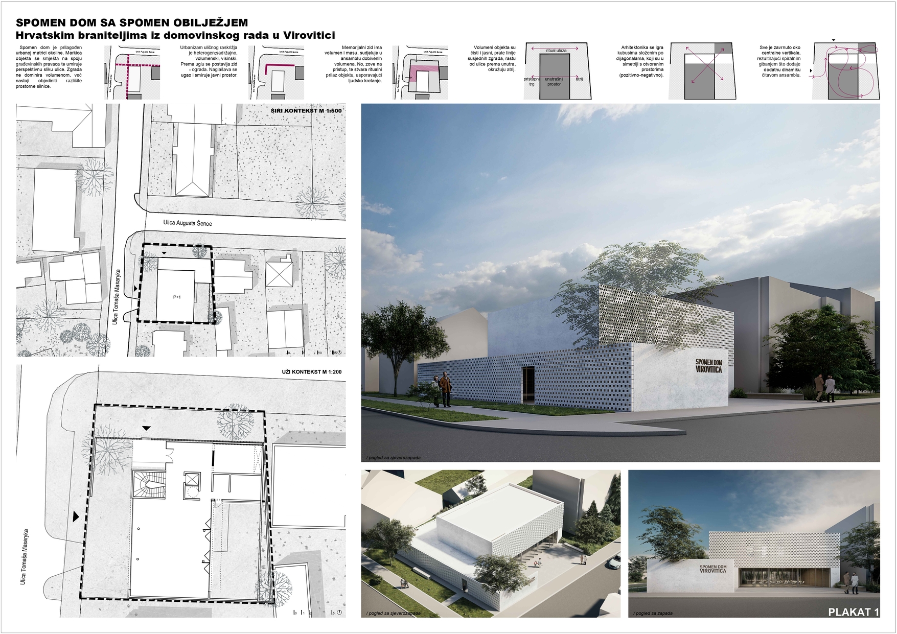 Grad Virovitica želi realizirati na zadanoj lokaciji rješenje visoke estetske, funkcionalne i oblikovne kvalitete unutar optimalnog financijskog okvira. Stoga se odlučuje na provedbu natječaja koji će omogućiti odabir najkvalitetnijeg rješenja između više ponuđenih autorskih radova. Idejno rješenje obrađuje Spomen dom hrvatskim braniteljima površine BRP cca = 1000m2 i Spomen obilježje hrvatskim braniteljima iz Domovinskog rata, sve u sklopu jedne parcele, riješeno integralno u skladu sa zadanim lokacijskim uvjetima.